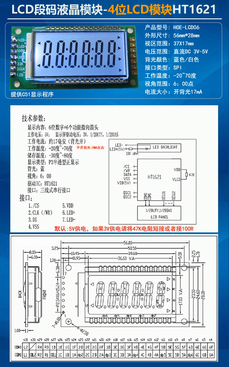 6位LCD段碼液晶模塊HT1628驅(qū)動(dòng)含背光