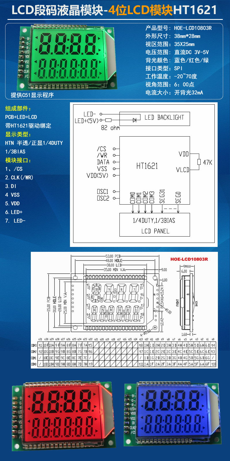 多色雙排LCD段碼液晶顯示模塊HT1621驅(qū)動(dòng)