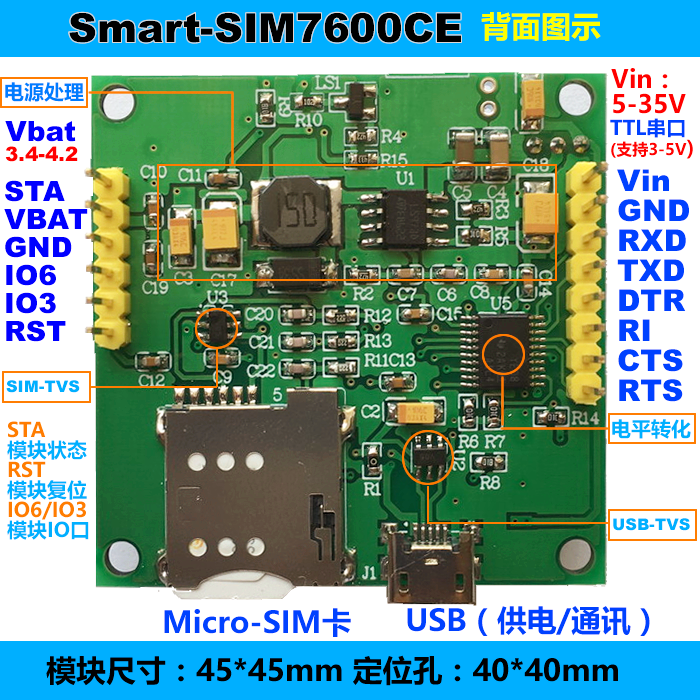 HOE-Smart-SIM7600CE 4G開(kāi)發(fā)模塊。支持全網(wǎng)通,支持USB通訊供電、外接5V-38V供電,不支持語(yǔ)音功能,采用Mcro-SIM卡自彈卡槽。 可接3.7-4.2V鋰電池;