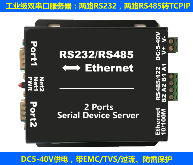 工業(yè)級雙串口服務(wù)器兩路RS232/兩路RS485,供電電壓5-40V,帶EMC/TVS/防雷保護(hù)。