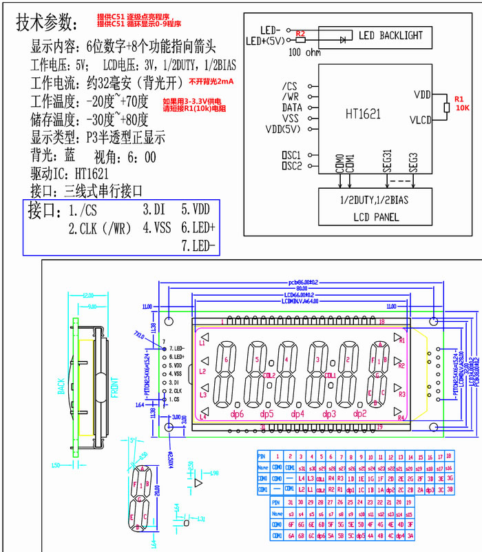 大尺寸86*38-6位L液晶LCD段碼模塊帶驅(qū)動(dòng)板HT1621 藍(lán)色背光